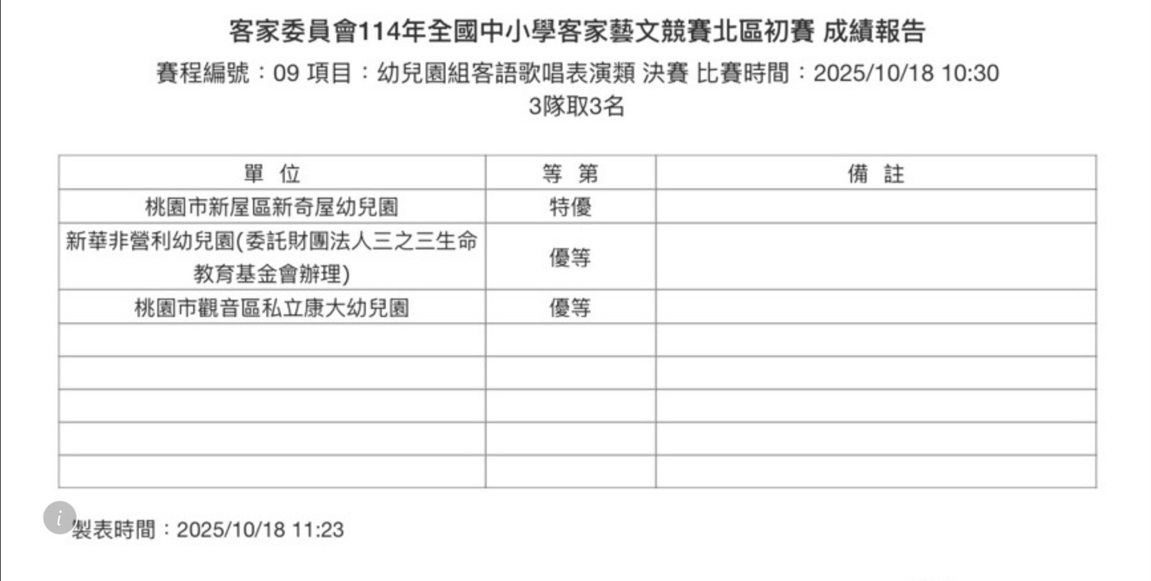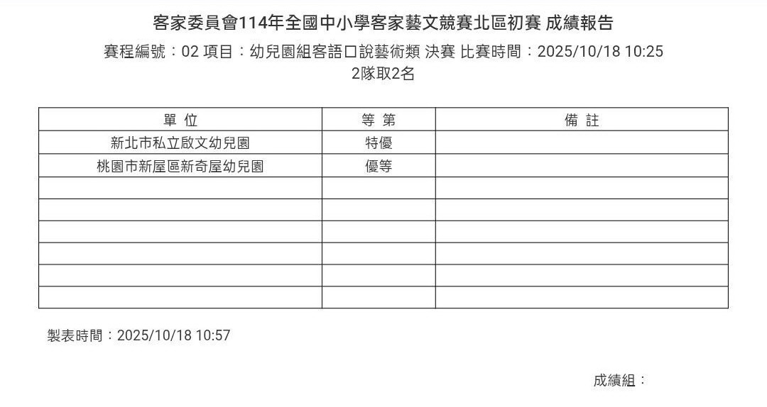客家委員會114年全國中小學客家藝文競賽北區初賽 成績報告